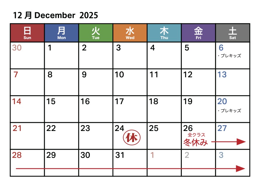 冬季休暇:2024年12月26日〜2025年1月4日ま
