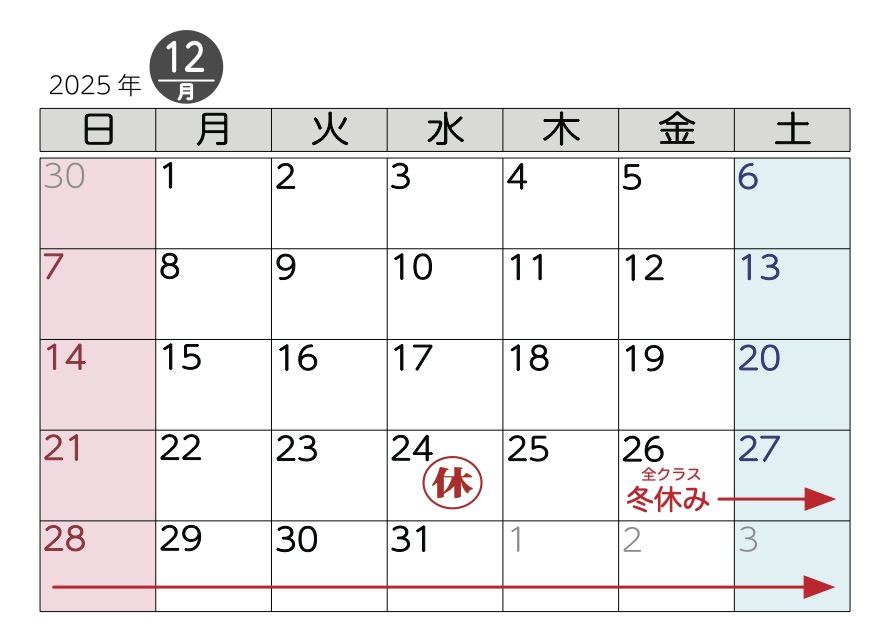 冬季休暇:2024年12月26日〜2025年1月4日まで