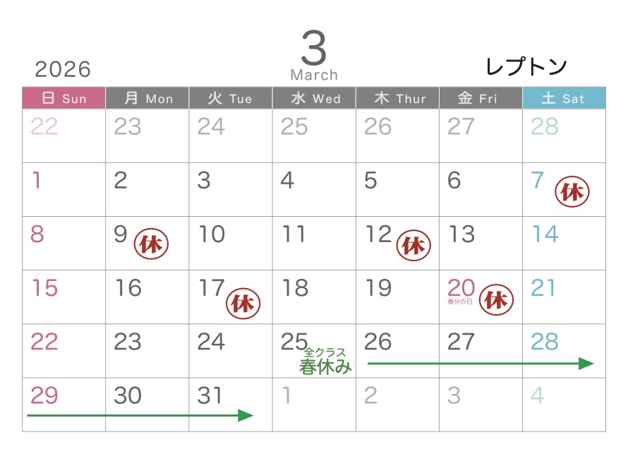 3月25日(水)〜より春休み期間となりレッスンはお休みになります。